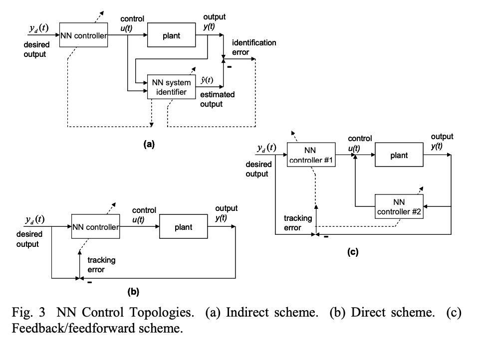 In adaptive control there are two main Neural Network Control Topologies: direct and inderect. Indirect control aims to learn dynamics of the unknown plant (dynamical system) via identifier block first; then it uses aquired information to control the plant via controller block. Direct control directly tunes the parameters of an adjustable NN controller.